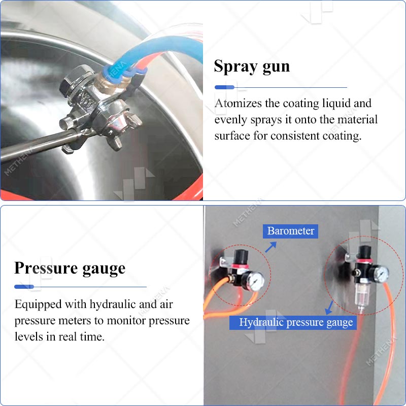 Atomizing Spray Gun: Engineered for high-precision atomization, the spray gun transforms the coating liquid into a fine mist, ensuring an even and consistent application across the entire surface of the materials.