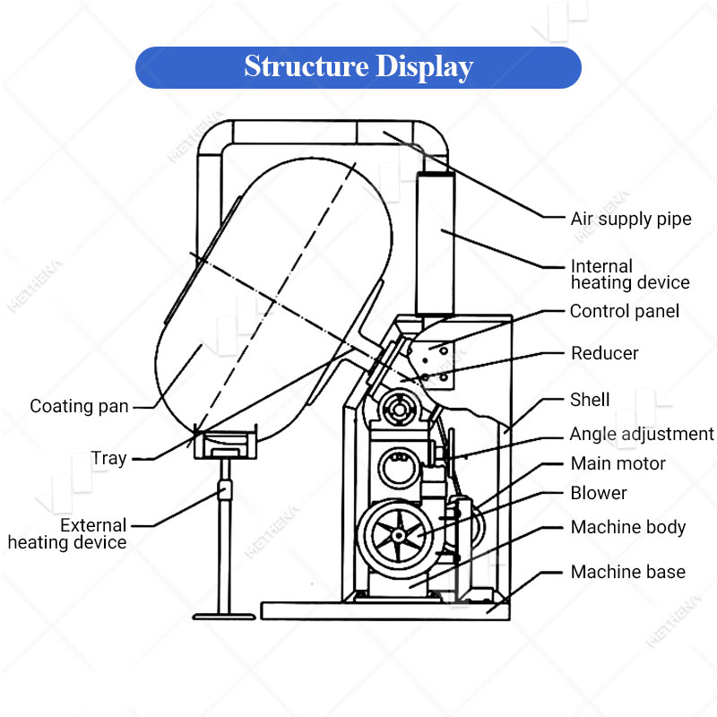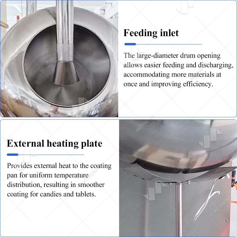 External Heating Panel: This system provides consistent external thermal distribution to the coating pan. By maintaining a uniform temperature, it ensures that candies and tablets achieve a flawlessly smooth and professional finish.