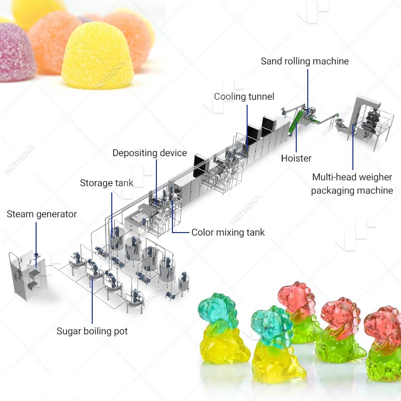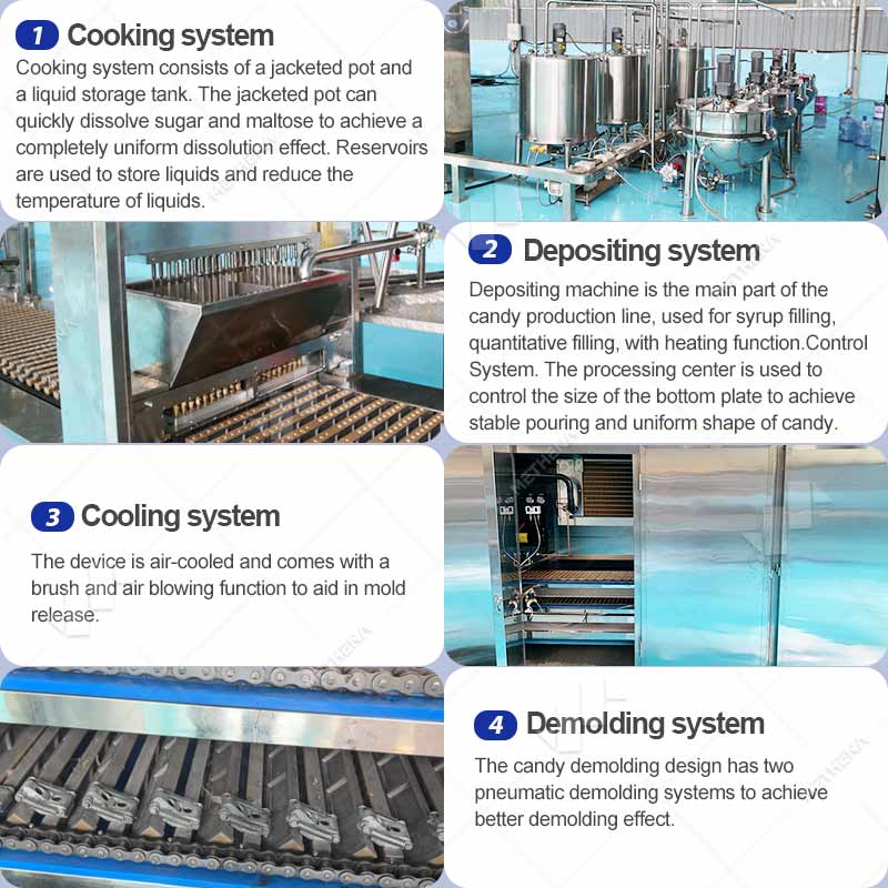 Fully Automatic Production System Soft candy can be automatically completed from raw material melting, blending, pouring molding, cooling, demoulding, oil spraying and anti-sticking, sugar rolling/polishing to final packaging, which reduces labor cost and improves hygiene level.