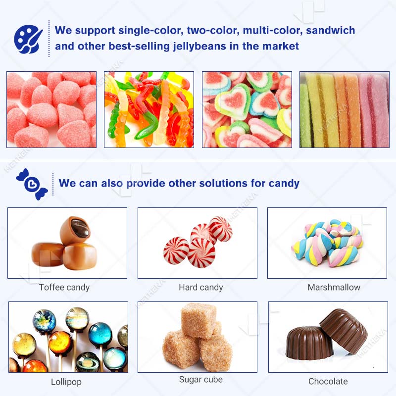 Multicolor Multilayer Structure It can produce the best-selling products in the market: monochromatic soft candy, bicolor/multicolor gradient soft candy, sandwich soft candy, and sandwich soft candy (jam, chocolate, explosicum center).