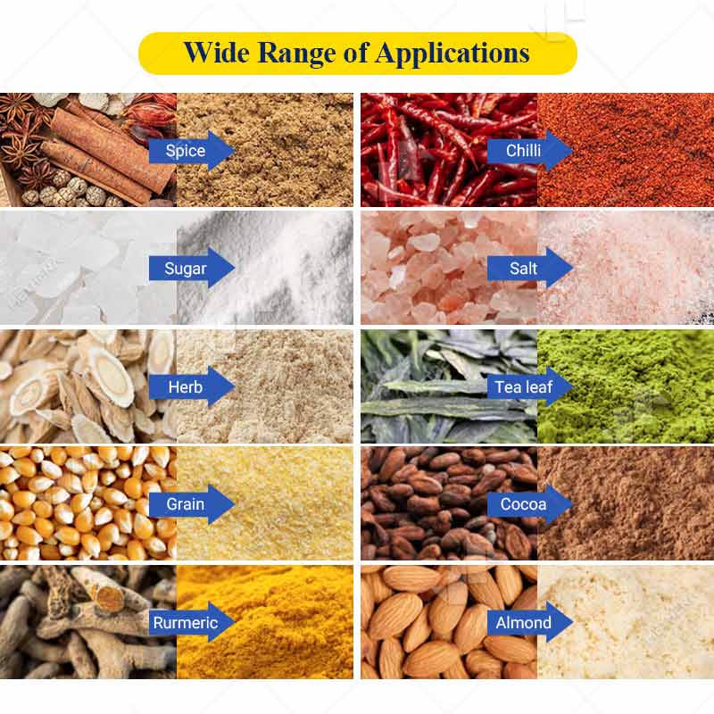 Food and Condiments: From turmeric in India to pepper in Mexico, the device can handle it easily. It is also an essential tool for a candy factory to process powdered sugar.